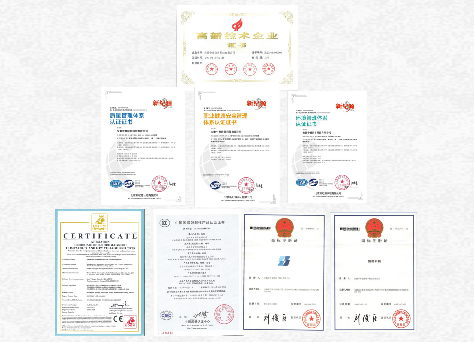 公司使用的產(chǎn)品均通過(guò)了北京雷電防護(hù)裝置測(cè)試中心等國(guó)家權(quán)威性檢測(cè)機(jī)構(gòu)檢測(cè),具有CE、CCC等相關(guān)認(rèn)證,以過(guò)硬的工程質(zhì)量獲得了中國(guó)人保的工程質(zhì)量承保。