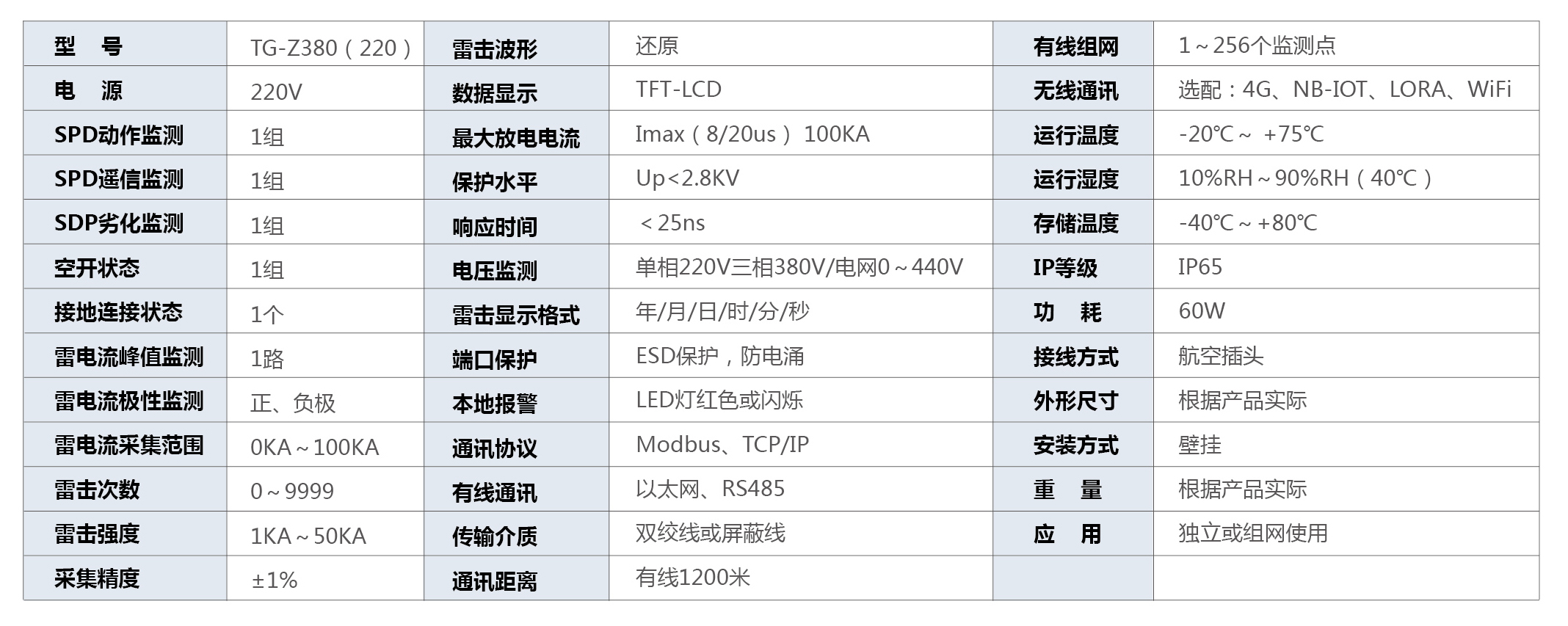 TG-Z380(220)系列智能防雷箱適用于電力能源、軌道交通、石油石化、?;V業(yè)、通信金融、民航高速、國防軍工、文物景點、政企教育、環(huán)保水利等各行業(yè)重要場所配電系統(tǒng)的防護,同時實現(xiàn)防護及防護裝置的全生命周期狀態(tài)監(jiān)測,通過防護及對裝置本身的實時監(jiān)測、數(shù)據(jù)記錄與分析,實現(xiàn)對防護裝置出現(xiàn)劣化或失效時及時響應,并做出應急解決方案和后期的防護決策。