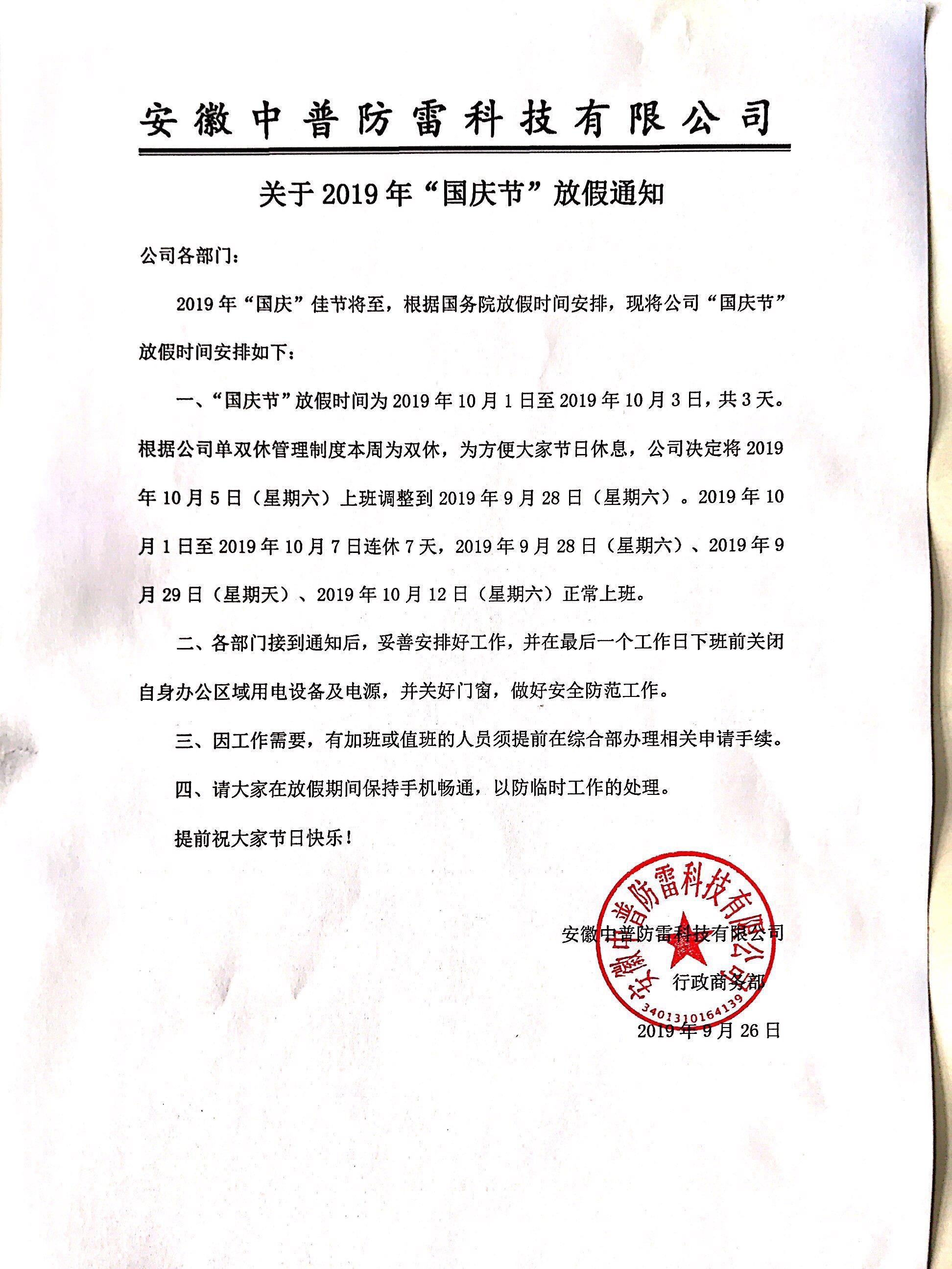 安徽中普防雷“關于2019年國慶節(jié)放假通知”