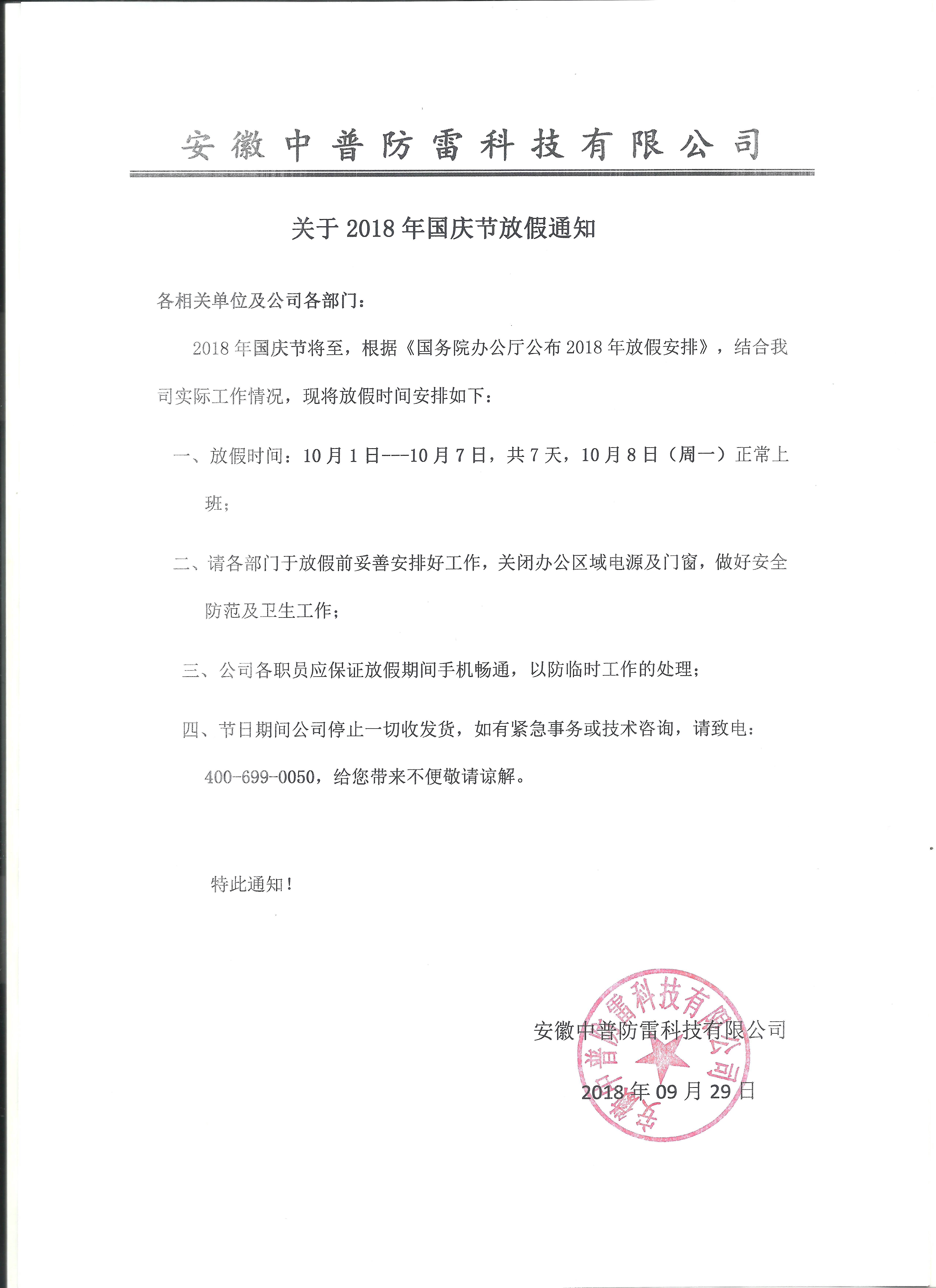 安徽中普防雷“關(guān)于2018年國(guó)慶節(jié)放假通知”
